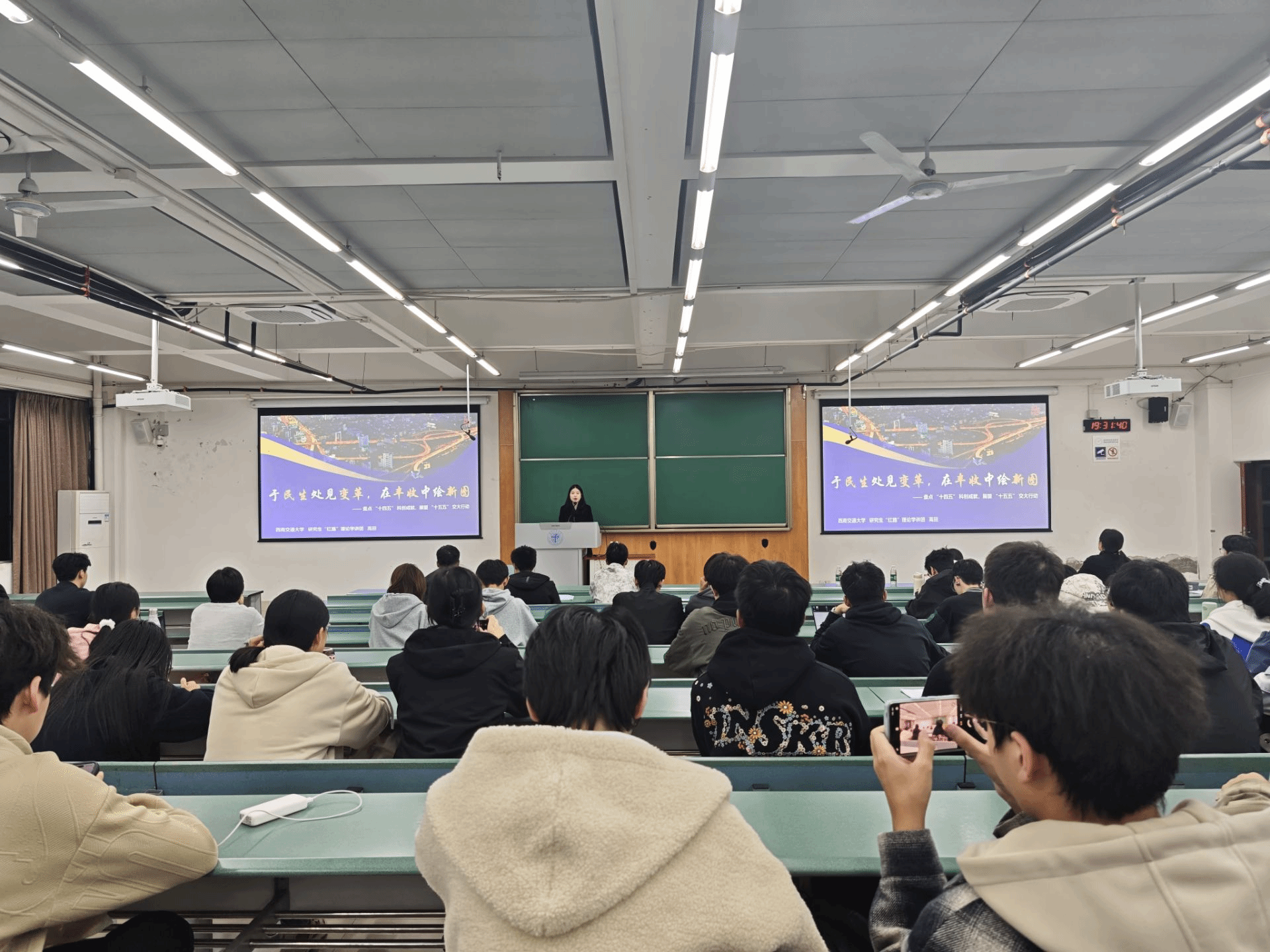 随后,高田讲师围绕“‘十四五’科技赋能,绘就发展新图景”这一核心主题,为同学们展开了深入的讲解。她首先对2025年10月党的二十届四中全会所通过的“十五五”规划进行了细致的解读,阐明了规划中“以科技创新引领新质生产力”这一重要发展方向。同时,她还详细介绍了西南交通大学在轨道交通领域的深厚科研积累,生动展现了高校在川藏铁路攻坚等国家重大工程项目中所展现出的责任与担当。她还以成渝地区为例,具体讲述了近五年来成都市在构建“空中丝绸之路+国际陆海联运”双走廊方面所取得的显著成果。