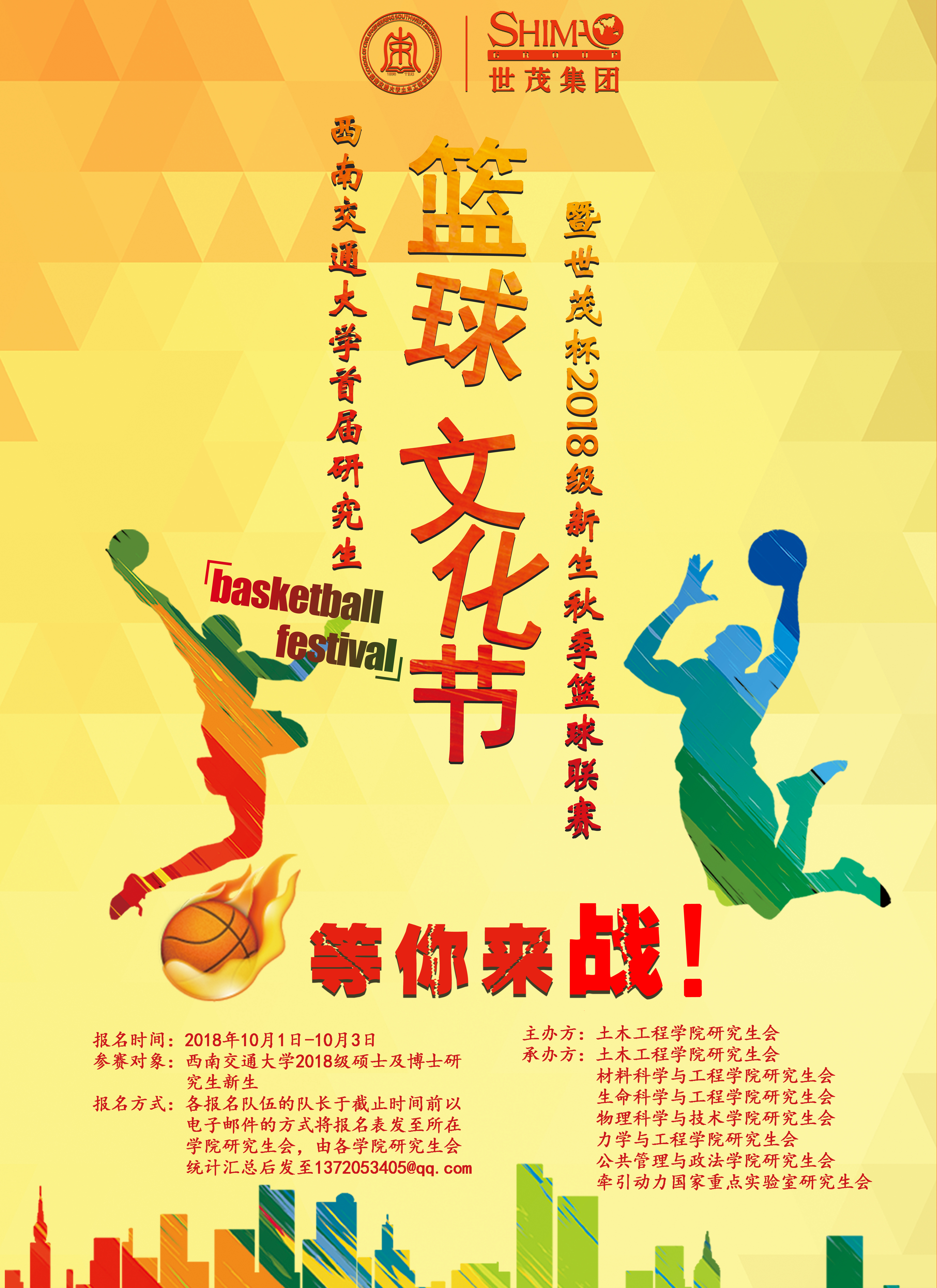 为了活跃师生文化生活,促进师生身心健康,增进各学院、各班级间的交流与友谊,根据各学院研究生会商议,定于10月份举办西南交通大学(九里)首届研究生篮球文化节暨“世茂”杯2018级新生秋季篮球联赛。为使比赛顺利举行,请各学院、班级按照以下内容组织报名。
