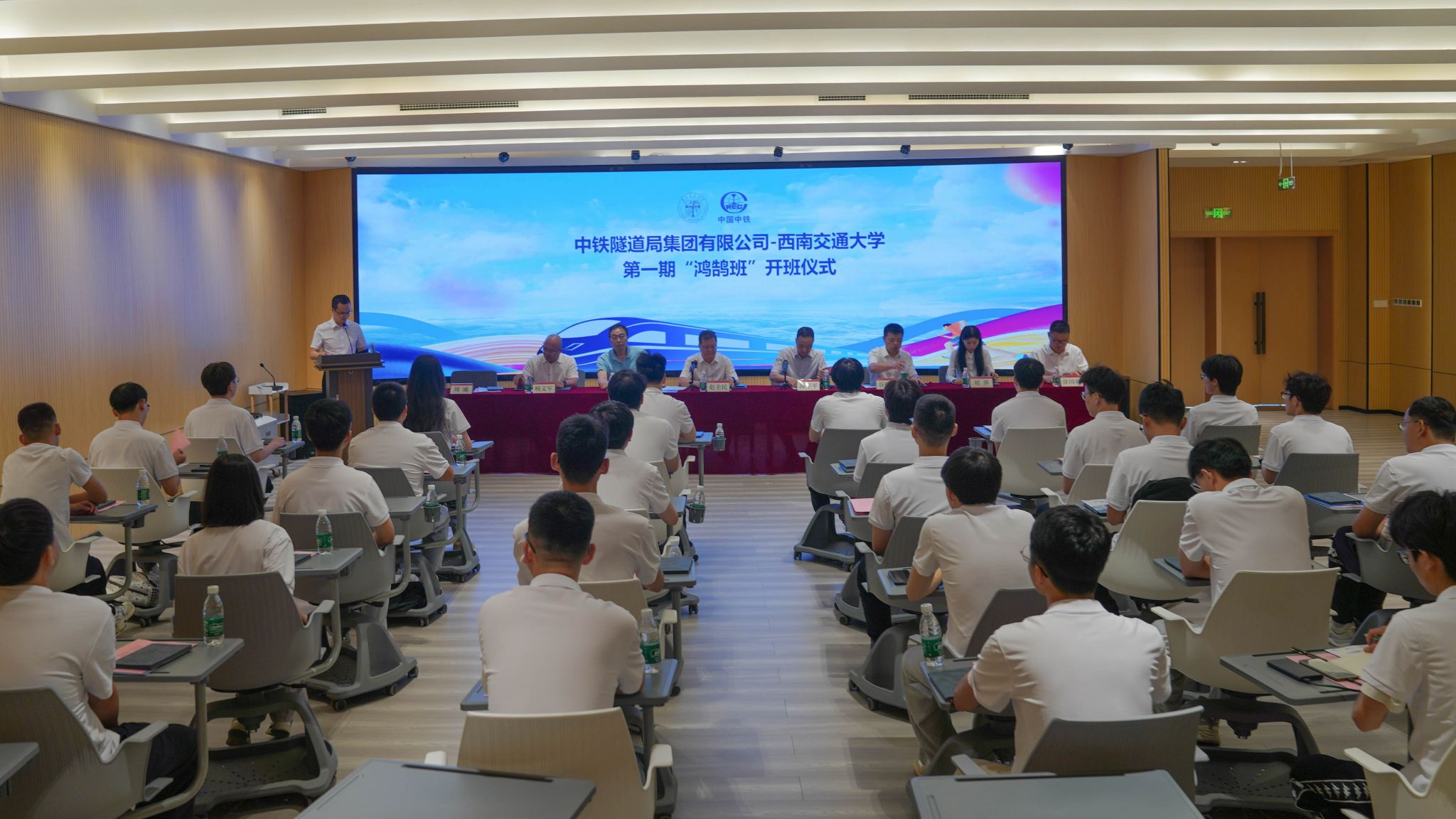 为积极贯彻落实新发展理念,增强在服务国家战略和区域经济发展中履行高水平科技自立自强的使命担当,促进科教融合、产教协同,推动毕业生实现更充分、更高质量就业。2024年7月6日上午,中铁隧道局—西南交通大学第一期“鸿鹄班”开班仪式于犀浦校区智能虚拟仿真实验教学中心隆重举行。中铁隧道局集团党委常委、副总经理赵全民,集团人力资源部副部长谷晓丰,一处副总经理杨文军,一处人力资源部部长徐国朝;西南交通大学党委副书记高平平,招生就业处处长、校友办主任陈岩峰,招生就业处副处长、土木工程学院党委副书记周曦,土木工程学院团委书记刘萍共同出席本次仪式。本次仪式由周曦副处长主持。
