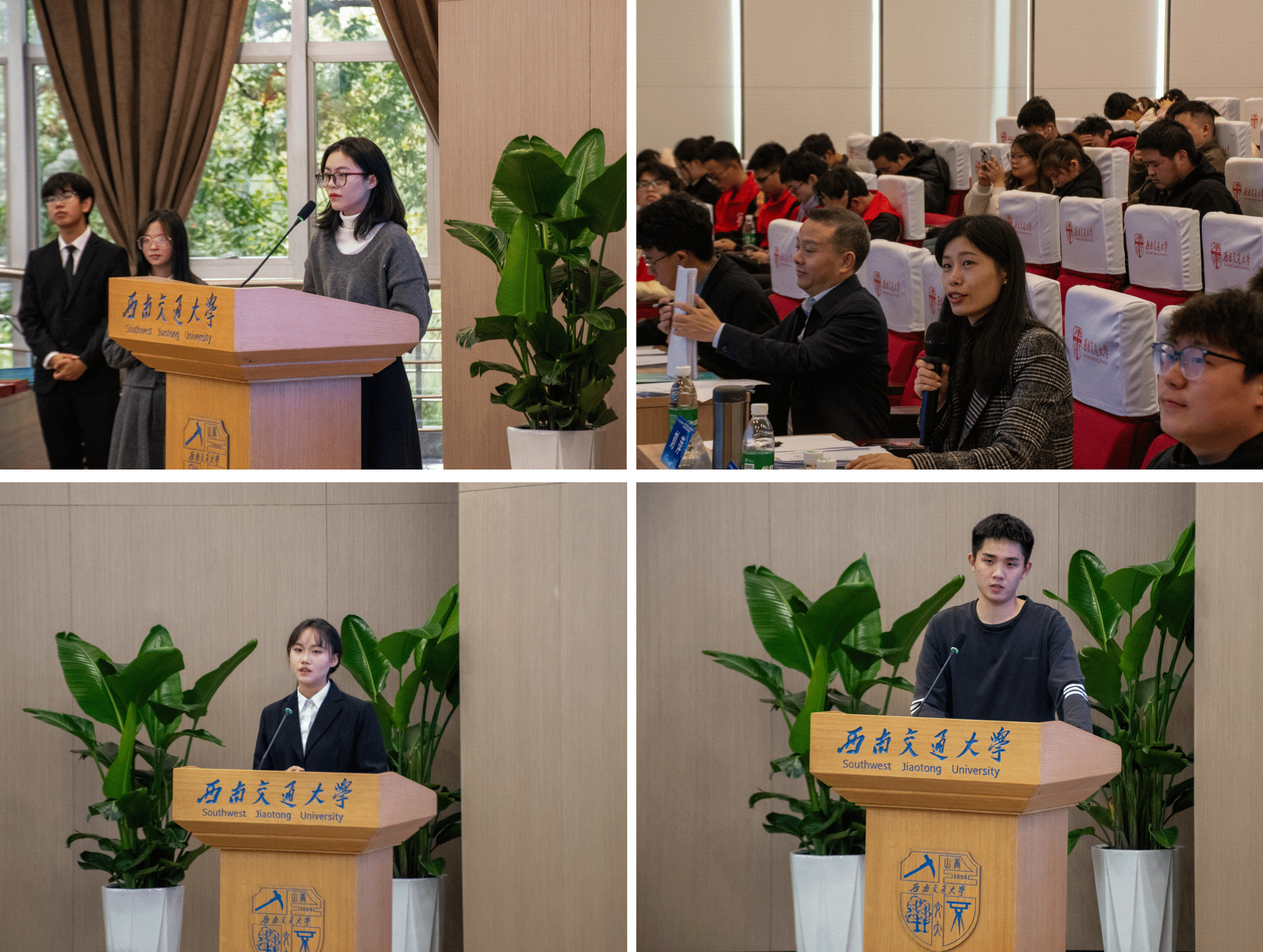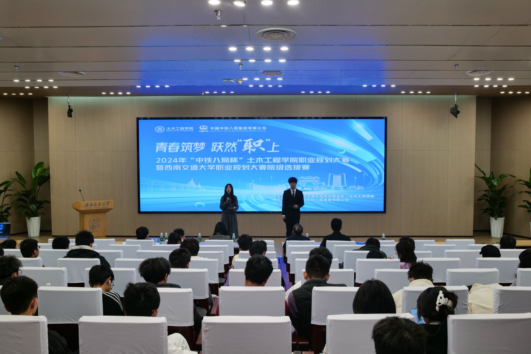 “青春筑梦,跃然“职”上”——2024112314点,2024年“中铁八局杯”土木工程学院职业规划大赛在西南交通大学犀浦校区图书馆二号报告厅顺利举行。本次大赛作为学校职业规划大赛院内选拔赛,旨在引导大学生树立正确的成才观、就业观和择业观,科学合理规划学业与职业发展,提升就业竞争力。中铁八局城市轨道交通分公司副总经理李彪、土木工程学院党委副书记刘萍、中铁八局人力资源部何宇森及辅导员出席并担任本次大赛评委,比赛共吸引了200余名学生到场观摩。