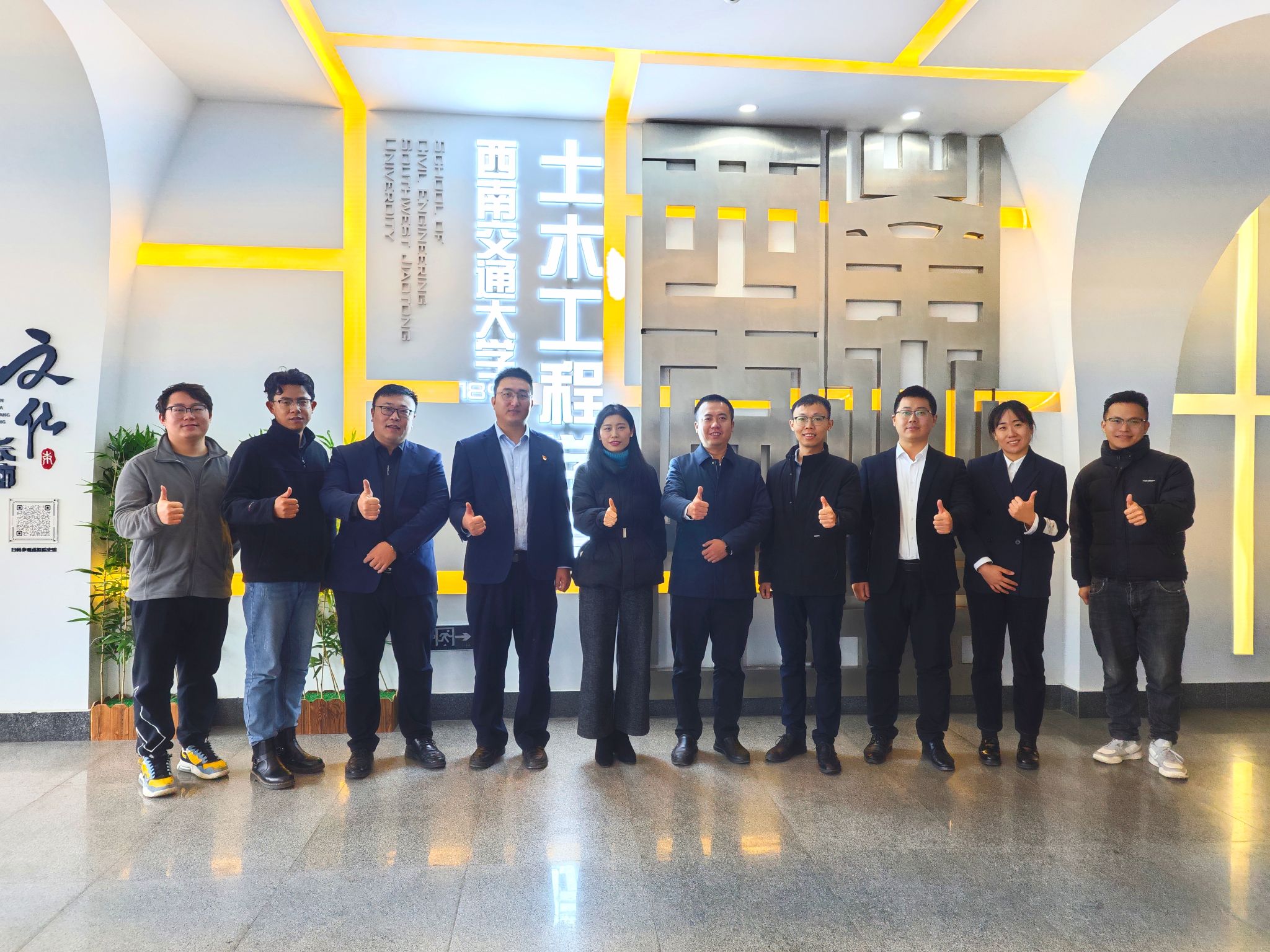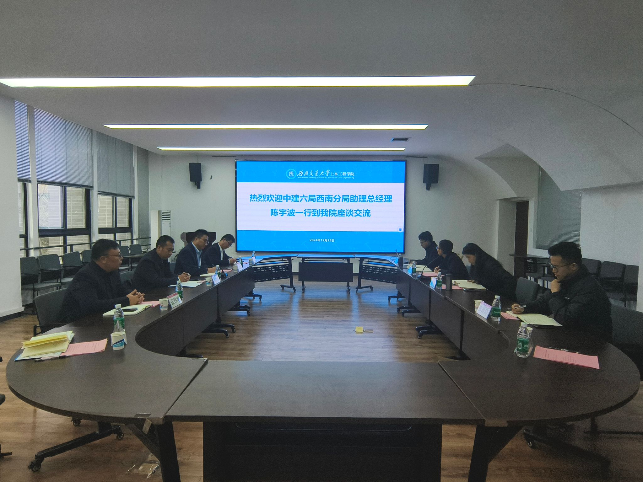 2024 1215日,中建六局西南分局助理总经理、第一营销部总经理陈宇波,中建六局第七建设有限公司人力资源部总经理林家辉等一行走访bat365中文官方网站,并于犀浦校4407会议室开展校企合作交流活动。土木工程学院党委副书记刘萍、学院团委副书记张进、辅导员李江怀、彭政涛、孟迪参与此次交流座谈。