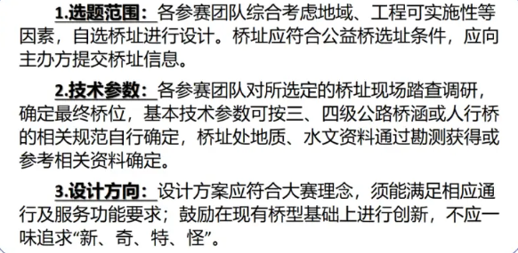 2.本次比赛包括两个赛项:赛项一(自选桥址)、赛项二(指定桥址),各参赛学校可以根据自身情况选择参加其中的一个赛项,或两个赛项均参加。