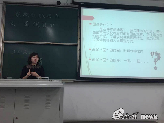为进一步提升土木工程学院大三年级学生求职技能水平及毕业生就业竞争力,响应学校“继续实施2015年度《大学生求职技能提升》的通知”以及具体的安排要求,就业与发展指导中心于近期针对大三学生开展了行业及就业技能提升培训,以帮助同学们解决对于未来就业即将面临的各种问题与困惑。2015年4月1日19:30,在X2427教室由熊麟老师为大家讲解了《求职技能培训之面试技巧》课程的相关内容。