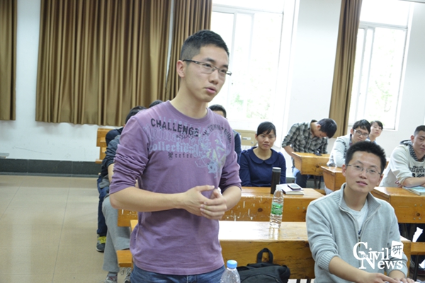 活动伊始,蒙国往博士进行了自我介绍,并对在场的研究生表示了祝贺。他说道,现在考研的竞争越来越大,尤其今年的隧道复试线高达375分,同学们应该为自己身为研究生而感到自豪。随后,蒙博士讲到了自己大四一边考研,一边找工作的艰苦历程,也为自己顺利保研而感到庆幸。他说道,“当一个人站在十字路口的时候,他应该遵从自己内心的选择,把它当成一种挑战,用心去克服它,最终肯定会有收获的。”从2011年保上研究生开始,渴望追求新东西的蒙博士就把心思放在科研上,通过坚持不懈的学习,他前两年就完成了研究生的大部分任务。紧接着,蒙博士指出了施工现场学习和做实验的重要性。他谈到了他2011年在昆明地铁考察和哈尔滨做实验的故事,提醒在座的研究生应该抓住下工地的机会,虚心向现场的工人学习,发扬不怕苦不怕累的精神,掌握必要的实验技能。他说道,“当你最艰难的时候,也是离成功最近的时候。”。接下来,蒙博士谈到了研究生期间写论文的重要性,并介绍了写论文的基本流程。他指出文献查阅要有针对性,文献要进行有规划的管理,并强调了文献阅读后思考的重要性。最后,他提到了健康的身体对学习工作的重要性,并以我国著名院士为例,指出健康是我们高效学习的基础。