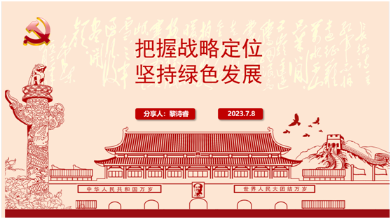 黎诗睿同学分享了“把握战略定位,坚持绿色发展”党日主题,作为新时代青年,始终牢记“高质量发展是全面建设社会主义现代化国家的首要任务。必须完整、准确、全面贯彻新发展理念,始终以创新、协调、绿色、开放、共享的内在统一来把握发展、衡量发展、推动发展”,在日常生活中,践行简约适度、绿色低碳的生活方式,拒绝奢华和浪费,形成文明健康的生活风尚;要有环保意识、生态意识,要有尊重自然、爱护自然的绿色价值观念,从身边的小事做起,为社会的生态环保思想建设贡献力量;让节约成为日常习惯,让节能成为生活态度,每一个人都应成为绿色低碳生活的践行者、倡导者和传播者。