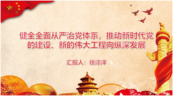 徐淙洋同学分享了“健全全面从严治党体系,推动新时代党的建设、新的伟大工程向纵深发展”党日主题,从六个方面进行讲解:坚持以党的政治建设为统领,坚守自我革命根本政治方向;坚持把思想建设作为党的基础性建设,淬炼自我革命锐利思想武器;坚决落实中央八项规定精神、以严明纪律整饬作风,丰富自我革命有效途径;坚持以雷霆之势反腐惩恶,打好自我革命攻坚战、持久战;坚持增强党组织政治功能和组织力凝聚力,锻造敢于善于斗争、勇于自我革命的干部队伍;坚持构建自我净化、自我完善、自我革新、自我提高的制度规范体系,为推进伟大自我革命提供制度保障。告诉大家强调遵守政治纪律,增强政治意识、大局意识、核心意识、看齐意识,用科学理论武装头脑,建立在对历史规律的正确认识上,建立在对基本国情的准确把握上,持思想建党和制度治党相结合,全方位扎紧制度笼子,更多地用制度治党管党。