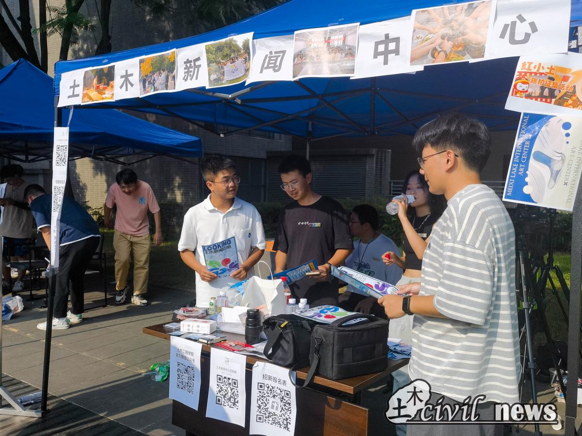 最后来到四号教学楼前,这是土木工程学院的“主战场”,无数优秀土木学子从这栋教学楼走向更广阔的天地。其浑厚的外形彰显着悠久的历史及丰厚的文化底蕴。而今天,本该幽静的四教中庭显得格外热闹,十大团学组织此刻正在进行一年一度的招新仪式。手持宣传单,各位热情的组织工作人员便走到新生前,积极介绍着组织相关工作内容,表达了对学弟学妹们真诚热烈的欢迎。而各大组织吸引新生兴趣的方式也是精彩纷呈,有租玩偶、摆摊套圈、抽奖等活动,饮料零食也是应有尽有,都用尽了热情去介绍自己,现场氛围活跃而融洽。