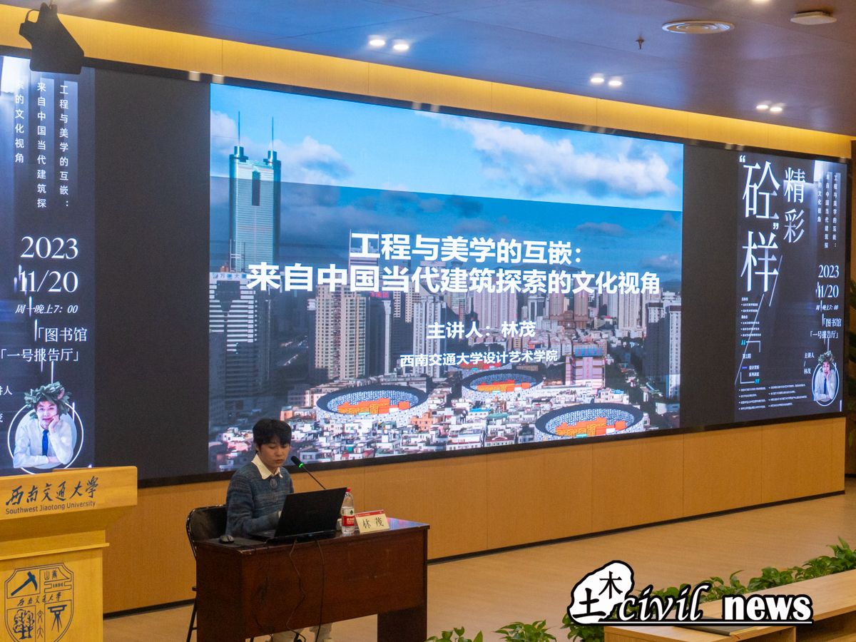 11月20日,由土木工程学院团委和设计艺术学院团委共同主办,土木工程学院学生会、设计艺术学院学生会及设计艺术学院研究生会联合承办的“砼”样精彩美育系列活动第一期设计赏析讲座—— “工程与美学的互嵌:来自中国当代建筑探索的文化视角”于西南交通大学犀浦校区图书馆一号报告厅举行。