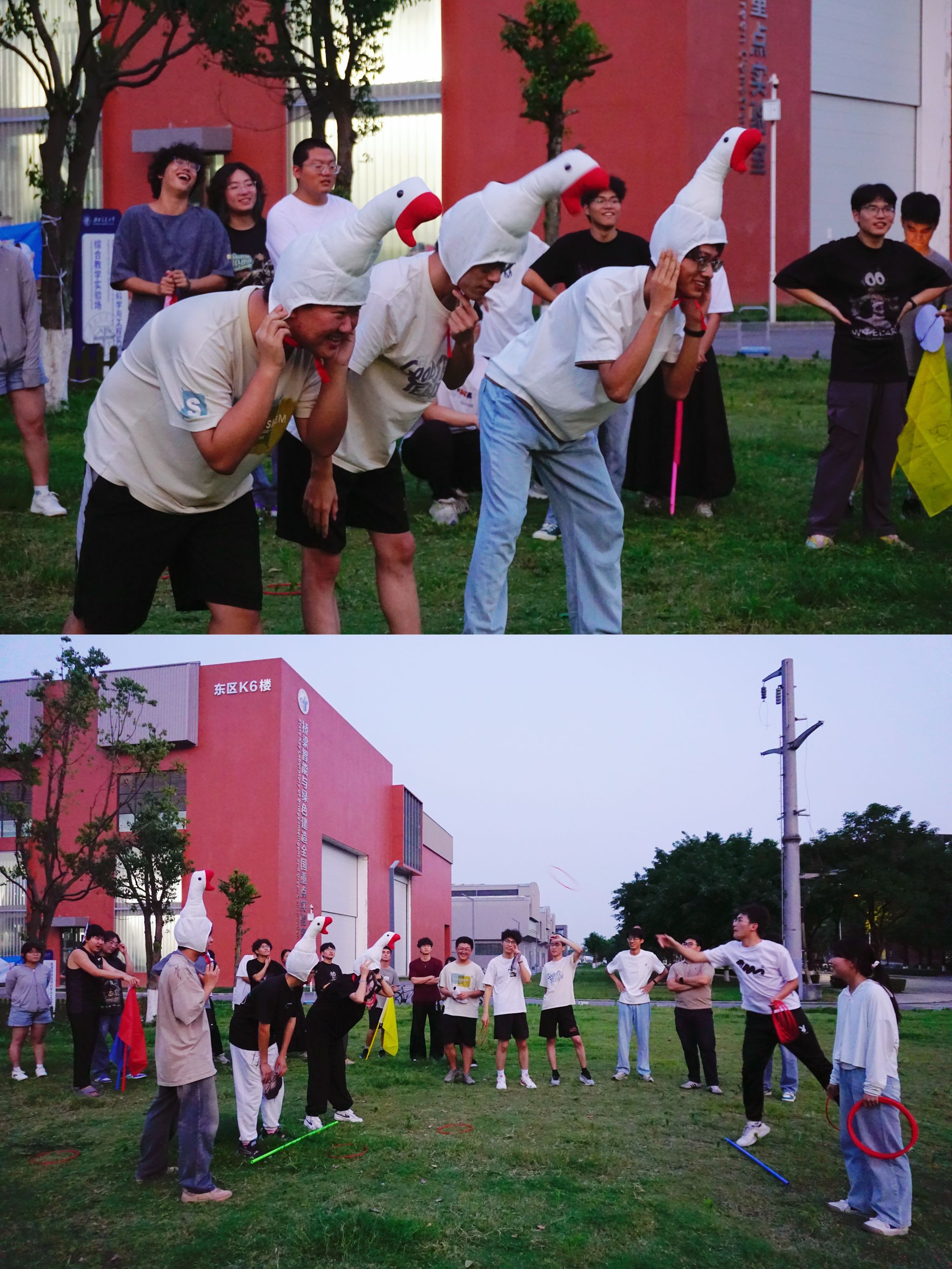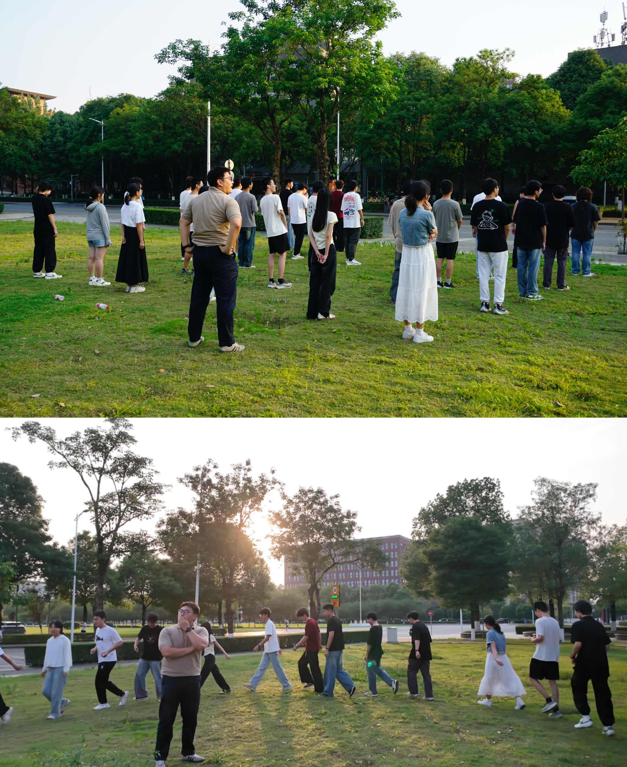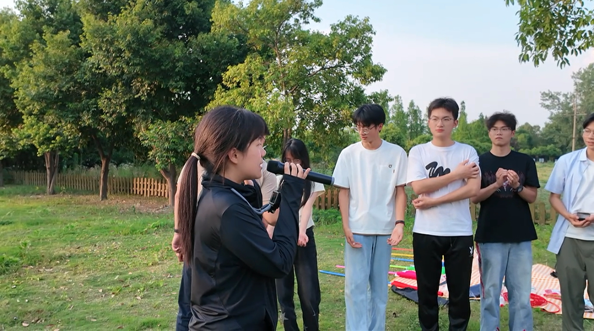 随后,户外素质拓展活动正式启动。在指导老师谭力豪的统筹与引导下,系列赋能环节有序推进。破冰环节中,同学们以小组为单位开展创意自我介绍,通过“兴趣标签”“成长故事”等特色分享,快速拉近彼此距离,初步链接起信任纽带。健身操环节中,伴随着明快激昂的音乐,同学们整齐律动,在尽情挥洒汗水的同时,释放了压力,强化运动健康意识。