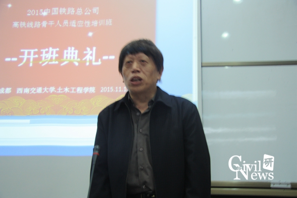 11月18日上午8:30,2015年中国铁路总公司“高铁线路骨干人员适应性培训班”开班典礼在西南交通大学九里校区0224教室隆重举行。土木工程学院任宝良副院长、土木工程学院继续教育中心江富长书记以及各个铁路局学员出席了此次开班典礼。此次培训班的学员主要由来自各铁路局及铁路集团的领导和高铁线路骨干人员组成,培训的目的是针对当前高铁工程一线生产作业状态,与学员一起学习研讨相应实际问题,提高学员的适应性能力,为以后的高铁生产作业提供理论和技术的双向支持。