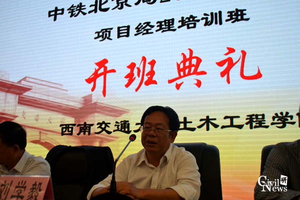土木工程学院党委书记刘学毅首先进行致辞,并对中铁北京局的各位领导和学员表示了热烈欢迎。刘学毅书记首先介绍了西南交通大学的基本情况以及一校两地三校区的办学格局,接着重点给各位项目经理介绍了土木工程学院的历史沿革以及当前的办学条件。他表示,土木工程学院是西南交通大学创一流示范性改革的重点学院以及排头兵,开办此次培训班是土木学院加强社会服务扩大学院影响力的重要举措,感谢中铁北京局对bat365中文官方网站的信任。