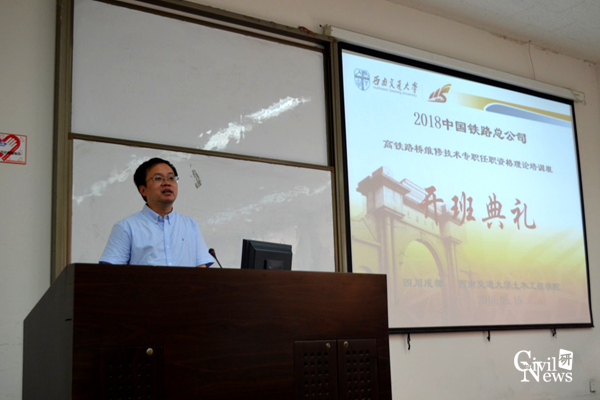 典礼上,占玉林老师首先进行了致辞。他对来自中国铁路总公司的各位学员表示了热烈欢迎,并强调,“我们将充分利用我校的高水平师资队伍及优势学科平台,争取让每位学员能有所收获,从而不辜负中国铁路总公司对我校的信任”。在致辞的最后,他也预祝学员们通过这期培训班能学有所成,度过一段愉快而充实的时光。