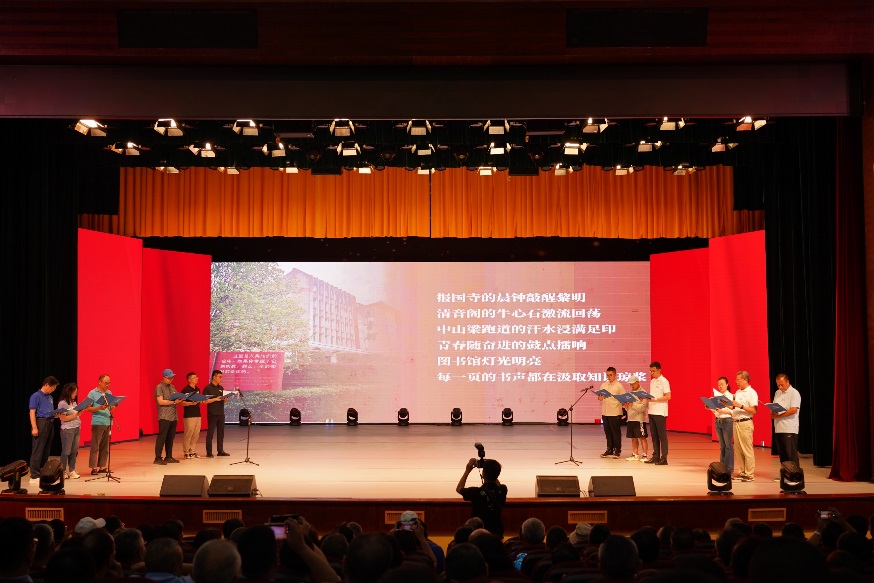 随后,12位来自1981级桥梁、铁道、隧道、工民建各专业,1990年代、2000年代、2010年代和2020级历届土木校友代表,集体朗诵了1981级桥梁专业庄勇原创诗歌《栋梁赞歌——跨世纪交大人的光阴答卷》。“报国寺的晨钟敲醒黎明,中山梁跑道的汗水浸满足印,青春随奋进的鼓点擂响”“若光阴逆流而上,若青春再度启航,我们仍会,义无反顾,选择交大;以山为砧,以血淬火,用生命锻成中国铁路最坚韧的钢梁!”赞歌齐诵,回荡会场,每一句都是交大土木人团结一心、奉献社会的精神传承,激荡起全场对行业使命的共鸣与自豪感。