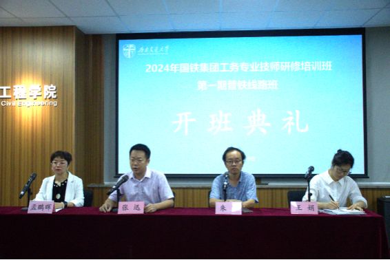 2024年6月19日上午8:30,国铁集团工务专业技师研修培训班(第一期)普铁线路班开班典礼在九里校区土木馆1234教室顺利举行。出席此次开班典礼的有土木工程学院培训中心副主任张迅教授、朱明老师、孟鹏晖老师以及培训中心的全体成员。开班典礼由bat365中文官方网站培训中心朱明老师主持。